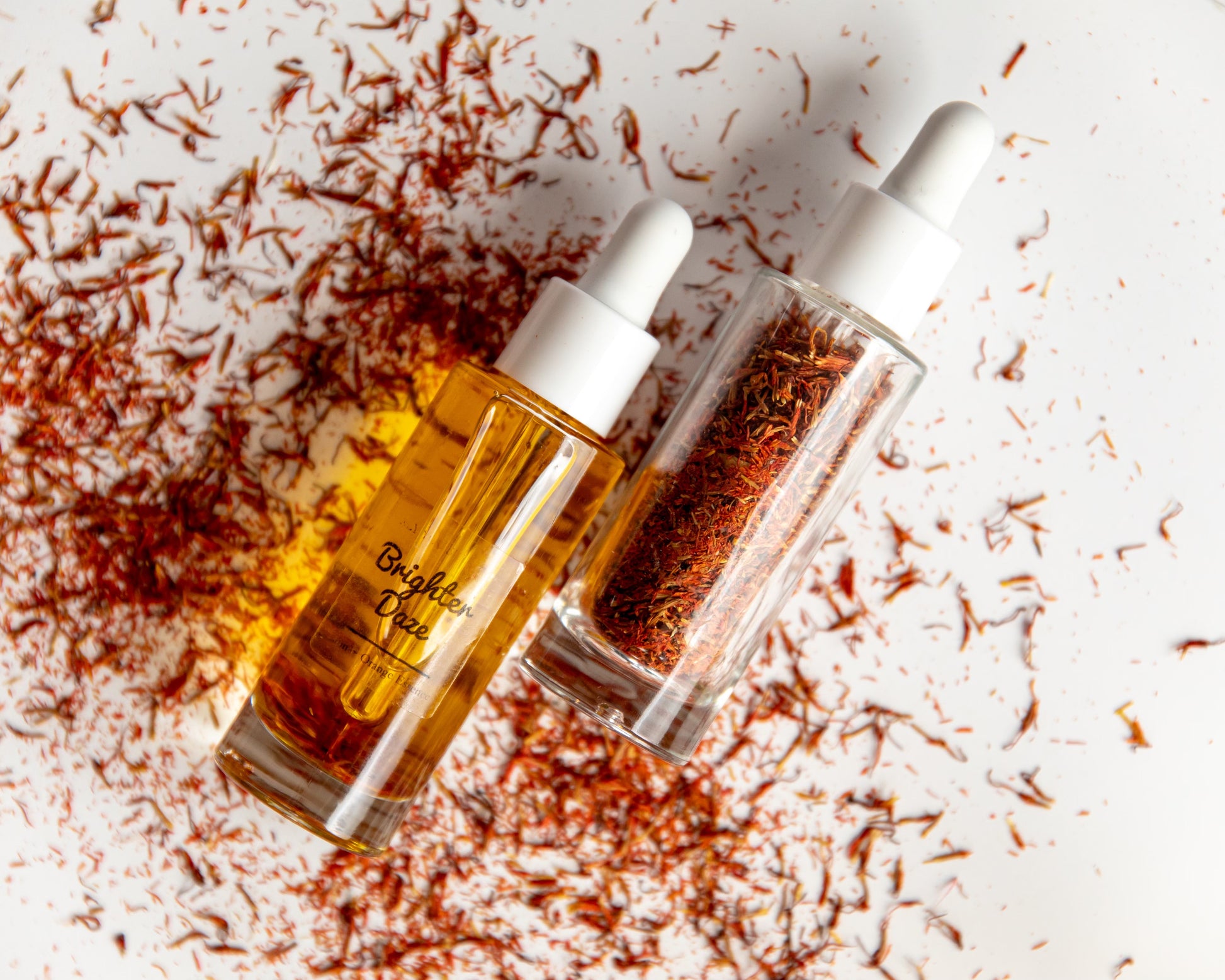 pure unrefined rosehip oil, pure unrefined vitamin E, and dried saffron stems.